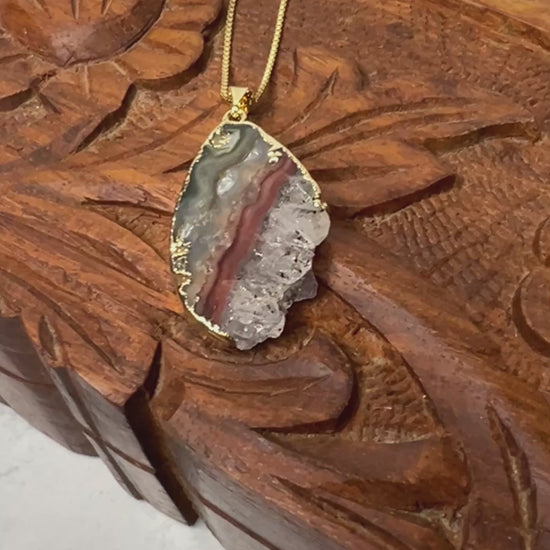 Electroformed gold tone on an amethyst slab pendant. This pendant is a muted color pallet with tan and brownish red banding. Pendant measures just over .75" wide at the widest part and 1.25" long. Tan and gold banding with clear to the lightest purple/clear amethyst. Just gorgeous. Gold plated sterling 16" chain.