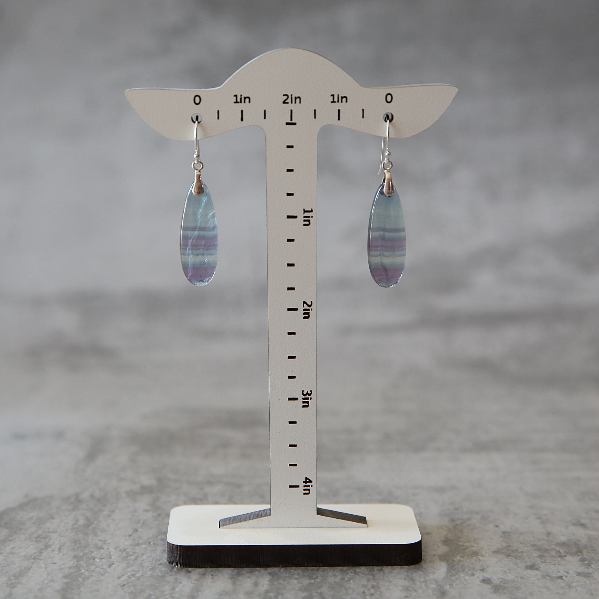 Softly luminous and effortlessly calming, the Blue Hour earrings feature natural fluorite in gentle layers of sea-blue, misty teal, and violet. Each elongated stone is polished to a smooth, glassy finish and suspended from sterling silver ear wires, allowing the colors to shift subtly with the light—just like the sky at dusk.