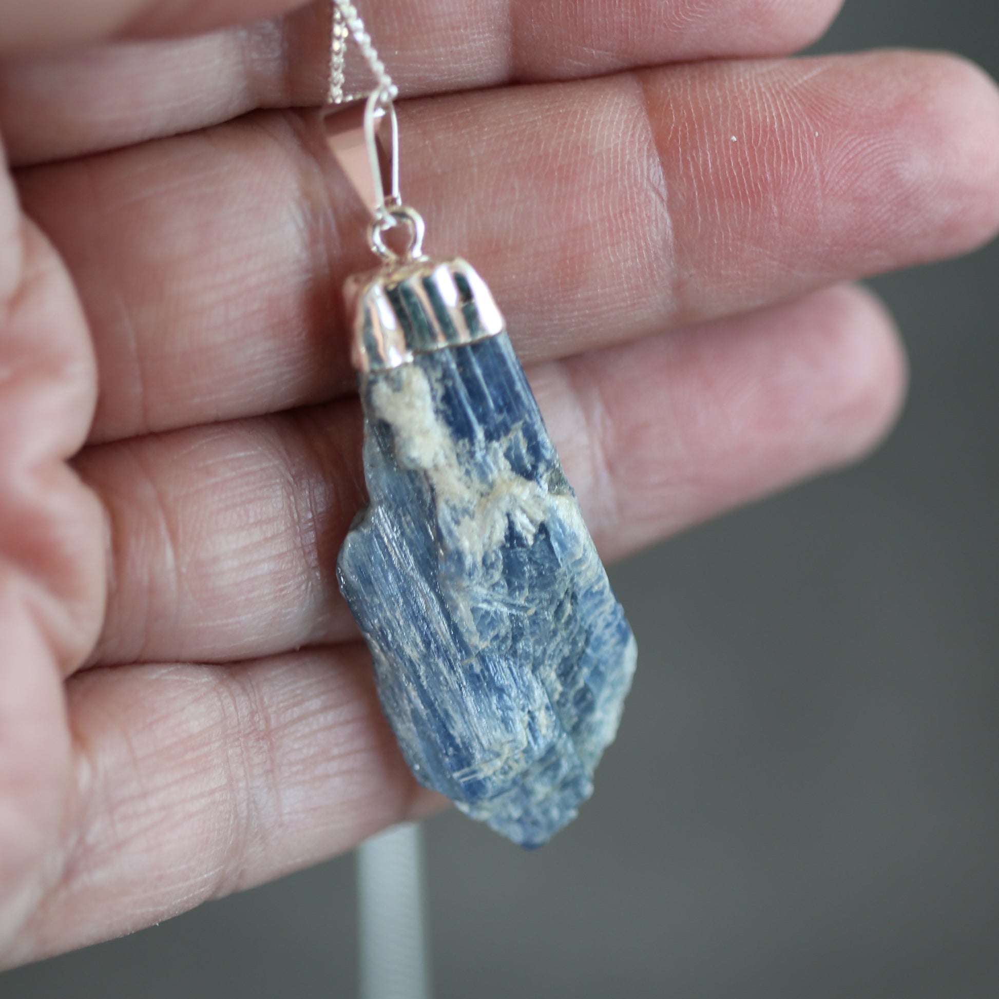 Just over an inch long and .5" wide, this blue kyanite is perfect and casual. Natural crystal electroformed with silver and a .925 chain.