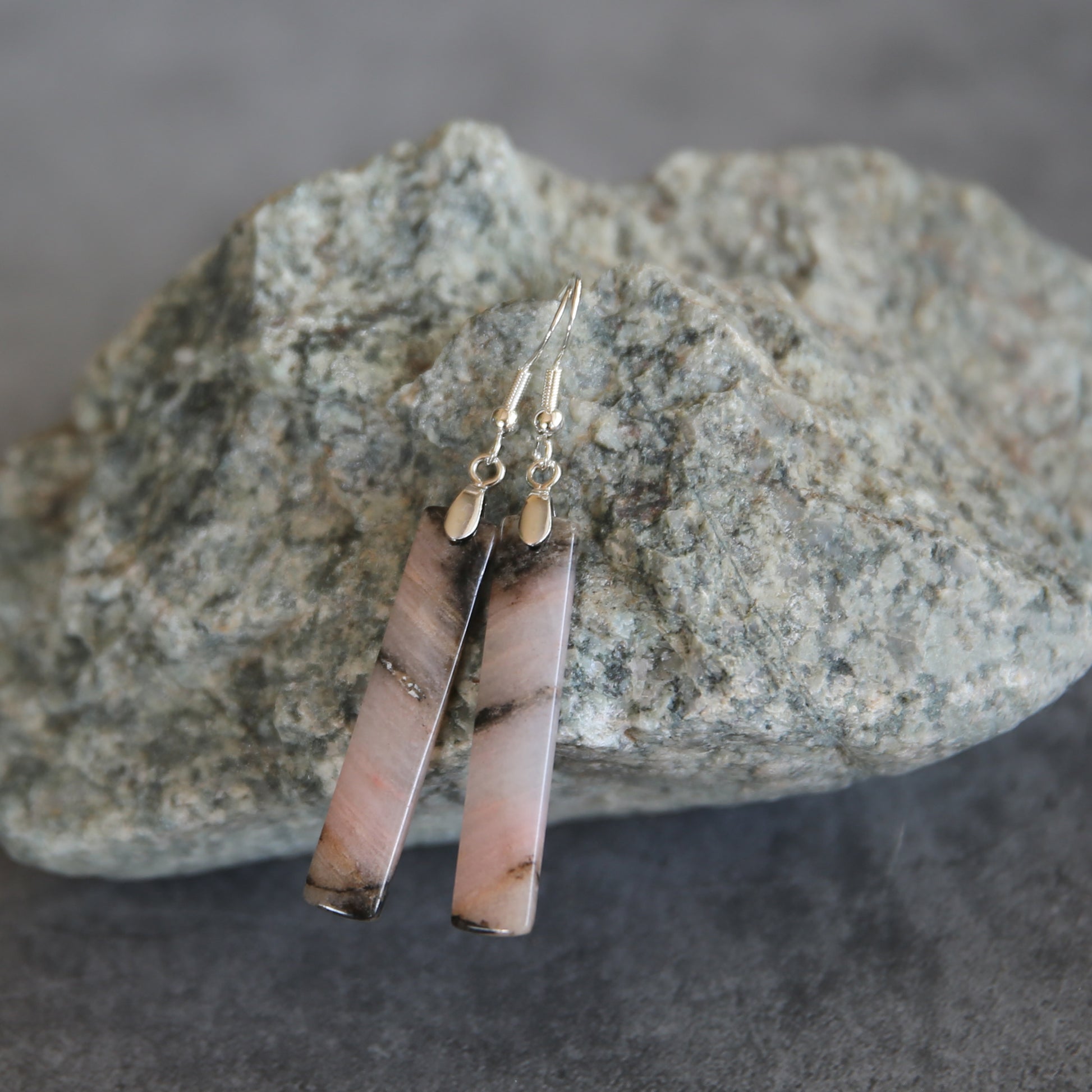 Handmade and one-of-a-kind earrings made from pink imperial rhodonite and sterling silver.