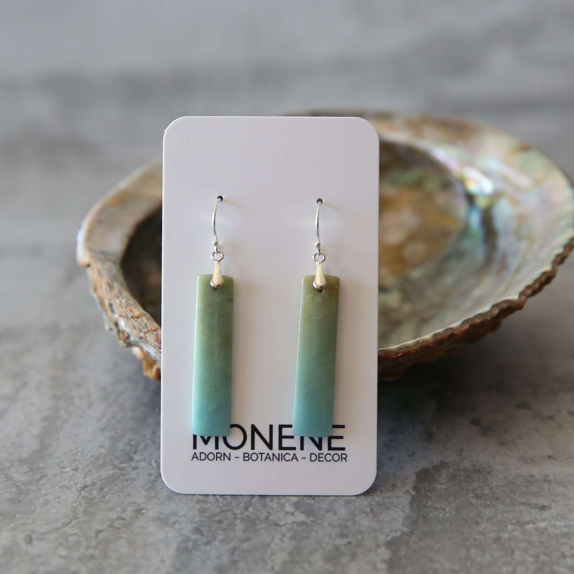 Inspired by tranquil waters and sunlit shores, Lagoon Light earrings feature smooth columns of natural amazonite in soft blue-green hues, each stone subtly unique in tone and pattern. Set with sterling silver ear wires, these earrings bring a sense of calm elegance and effortless wearability to any look.