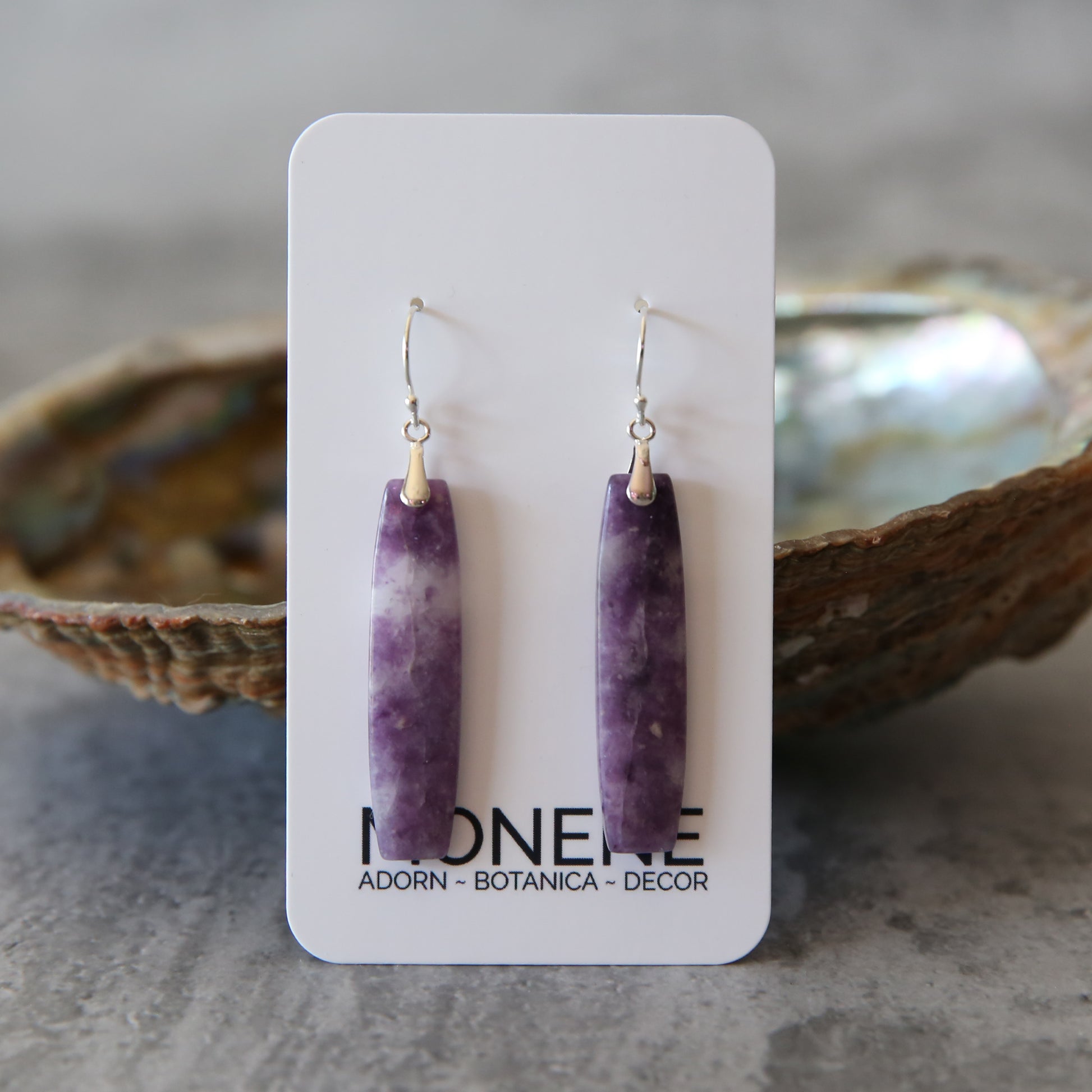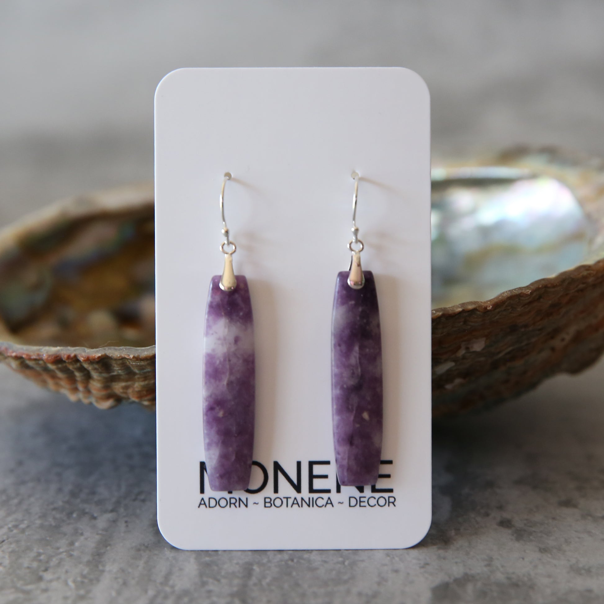 Soft, tranquil, and effortlessly elegant, the Lavender Haze earrings highlight the serene beauty of natural lepidolite. Gentle washes of violet and lavender tones drift through the stone, creating a dreamy, mist-like effect that feels both calming and refined. Set in sterling silver, these earrings offer a graceful, understated statement perfect for everyday wear.