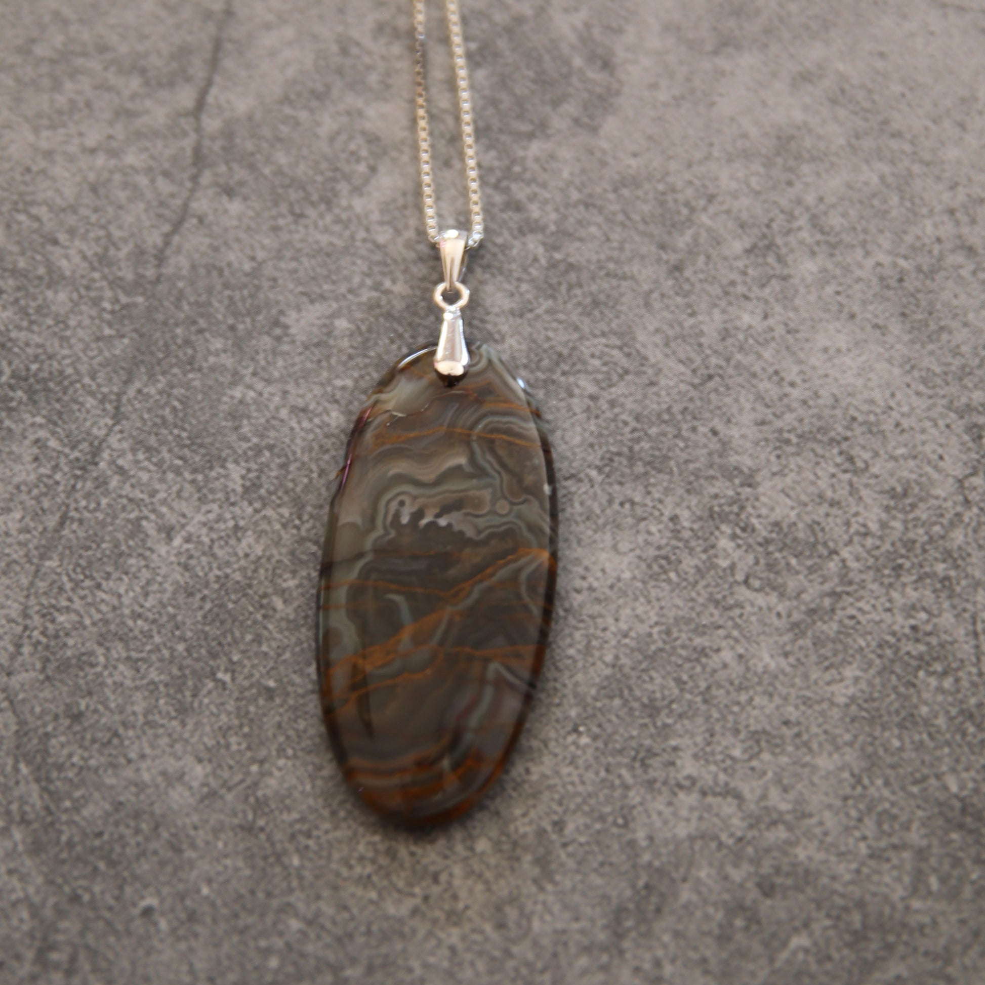 The Storm Veil Necklace holds the mystery of gathering clouds and distant thunder. This Mexican agate reveals swirling patterns of charcoal, amber, and silver-gray — like lightning traced through stone. Formed over millennia, its layered beauty speaks of strength through change and calm after chaos. Set in sterling silver, it’s a grounding piece for those who find peace in life’s natural rhythm — a fragment of the storm, stilled and eternal.