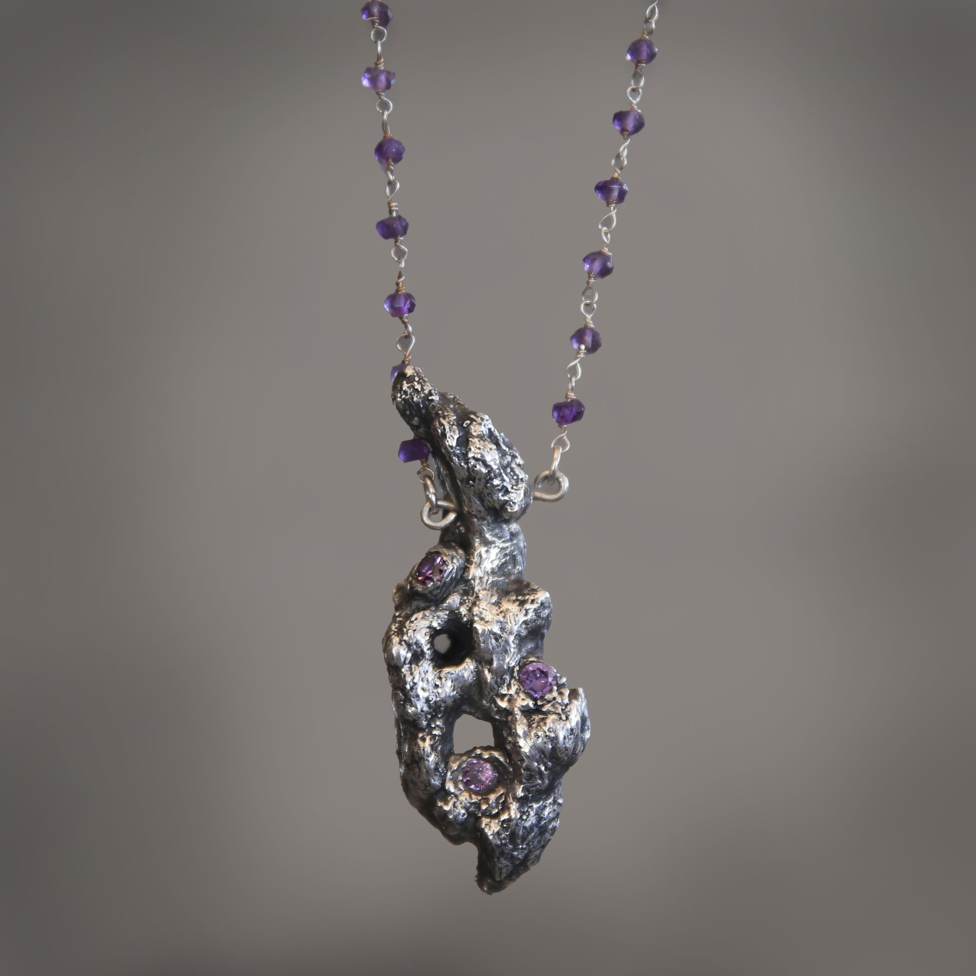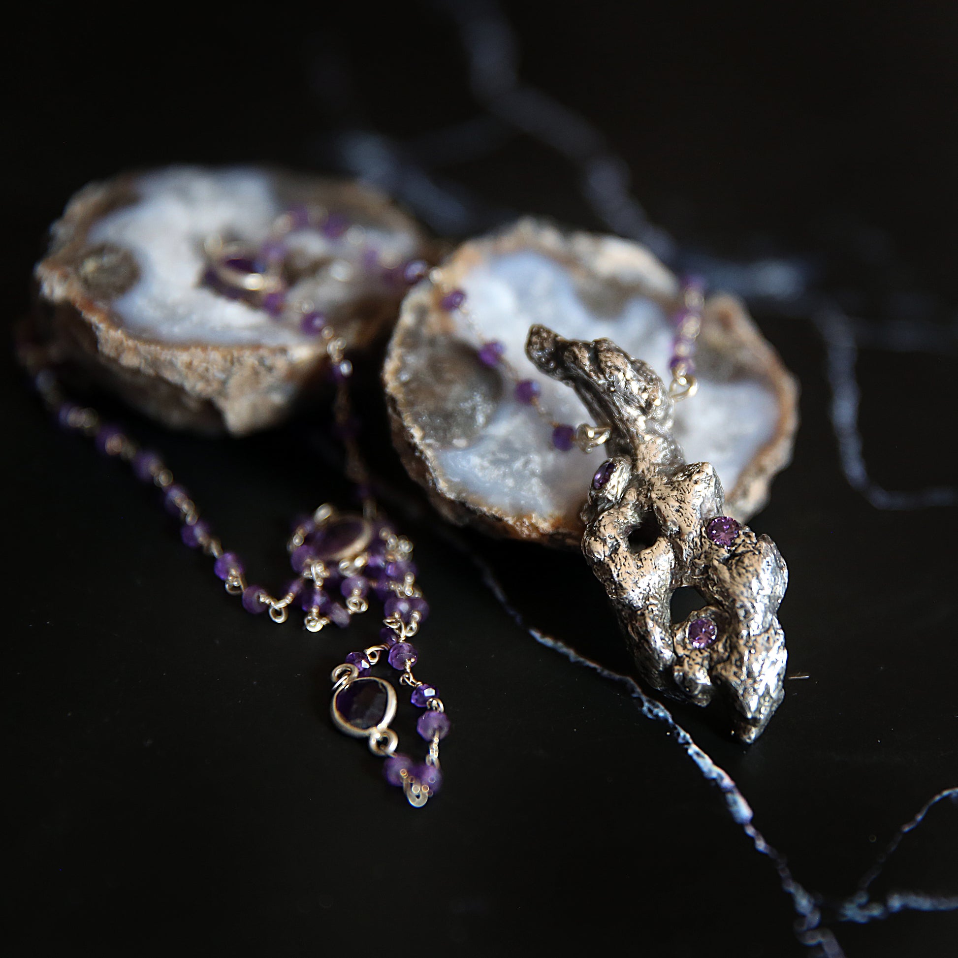 "Violet Desert" is a necklace that captures the raw beauty and quiet power of the desert at dusk, where the land is painted in violet hues and the air hums with energy. Crafted from fine silver, the piece cradles a delicate cholla cactus skeleton — a symbol of resilience and strength in harsh landscapes. At its heart is amethyst, its violet glow embodying spiritual clarity, calm, and protection. Together, these elements create a piece that evokes the serenity and mysticism of the desert, offering both grounding energy and a deep connection to the natural world. Violet Desert serves as a reminder that even in the harshest conditions, beauty and strength can thrive.