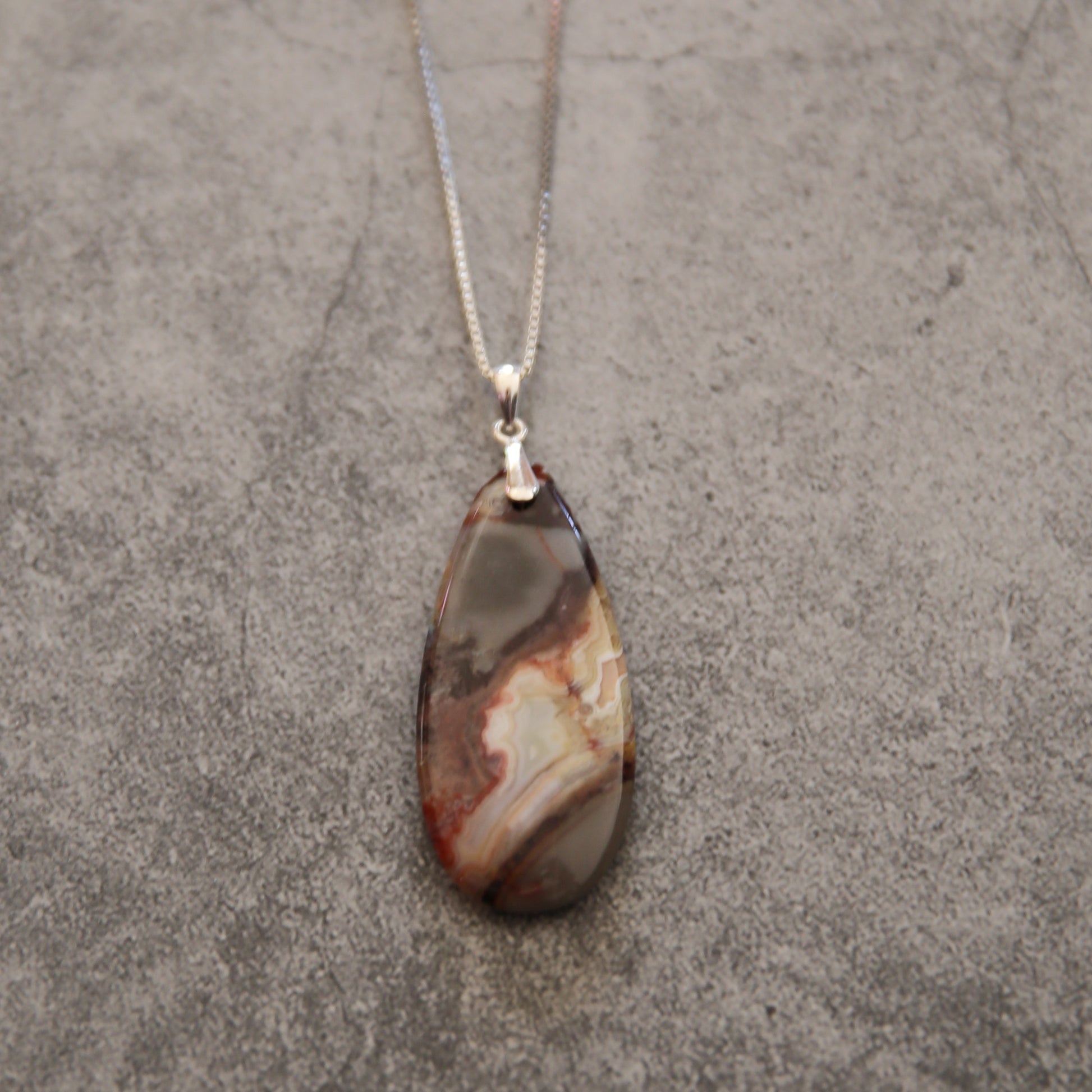 The Whispering Earth Necklace captures the quiet poetry of the Mexican landscape — where ancient stone and time intertwine. This Mexican agate, with its flowing bands of crimson, cream, and ash, seems to hold the soft echo of shifting sands and distant winds. Set in sterling silver, it’s a talisman of grounding and transformation — a reminder that even the earth tells stories if you listen closely.